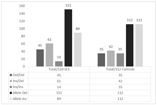 Los resultados del presente estudio reflejan que los PL tenían mayor expresión del genotipo Ins/Del (heterocigosis) (50.8%), a diferencia del GC, evidenciándose que los genotipos homocigotos Ins/Ins (31.25%) y Del/Del (31.25%) eran los más frecuentes. En cuanto al polimorfismo a nivel de alelo, se pudo destacar entre los PL, que el alelo deleción es más frecuente que el alelo de Ins, mientras que el GC, ambos alelos se expresaron en la misma frecuencia. Observándose una asociación entre el polimorfismo heterocigoto Ins/Del presenta una asociación significativa de riesgo a LES en nuestra población estudiada con un O.R de 1.32, al igual que el alelo de deleción, que se muestra como alelo de riesgo con un O.R de 1.70, a diferencia del alelo Inserción que presenta una asociación significativa de protección a LES con un OR de 0.59.