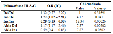 Un estudio realizado por Consiglio et al.24 en población brasileña, observó que luego que estudiar 195 PL frente a 122 individuos aparentemente sanos, se evidencio un exceso de heterocigosis (Ins/Del) de 53.9% en PL a diferencia del GC que presentaba un 50% de heterocigosis. Sin señalar ningún resultado estadísticamente significativo con respecto a los genotipos, sin embargo, estos autores observaron un ligero aumento del alelo Ins en PL frente al GC. Al igual que el trabajo realizado por Wu et al.28 que describió una falta de asociación entre el polimorfismo Ins/Del de 14 pb en la región no traducida 3´UTR del gen HLA-G en LES en pacientes chinos.