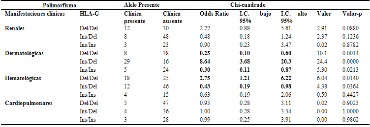 Después de evaluar el papel del polimorfismo en la región 3´UTR del HLA-G con susceptibilidad a LES, se evaluó, si alguno de los genotipos y/o alelos se asocia como factor de riesgo a manifestaciones clínicas observadas en los pacientes que participaron en el estudio. Los pacientes se estratificaron según presentaron o no un determinado parámetro clínico, esto con el fin de encontrar alguna asociación genética que nos brinden información acerca de las complicaciones clínicas que puedan presentarse en los pacientes.