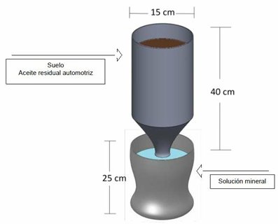 En la tabla 1, se detallan las propiedades fisicoquímicas del suelo agrícola sin contaminar por el ARA18, con un pH de 6.02 ligeramente ácido, con bajo contenido en MO 0.58 %, una pobre concentración de N total de 0.11%, una alta capacidad de intercambio iónico de 26.64 C×mol(+) Kg-1 o salino, con una composición de la textura: arcilla de 50 %, limo 7 % y arena 43 %, por lo que el suelo se clasificó como arcilloso, este suelo se tamizó con una malla del No. 20, solarizó por 48 h y redujo el problema de plagas y enfermedades, posteriormente se contamino con el ARA, y comenzó la BIO del suelo al disolver los 100000 ppm de ARA en el detergente comercial “La Corona” al 0.5 % (p/v). Entonces 1.0 kg de este suelo contaminado con el ARA, se colocó en la parte superior de la jarra de Leonard, en la inferior se depositó agua o solución mineral (SM), ambas partes se conectaron por una tira algodón, para el movimiento del líquido por capilaridad (figura 1).