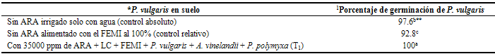 En la tabla 1, se muestra la germinación de las semillas de P. vulgaris sugiere la acción benéfica de A. vinelandii . P. polymyxa que convirtieron los exudados de las semillas de P. vulgaris en fitohormonas que aceleraron y alcanzaron al 100% de germinación de las semillas de la leguminosa22, mientras esta reportado que esta clase de géneros y especies de bacterias benéficas para plantas tienen la capacidad para utilizar como fuente de carbono y energía algunos de los hidrocarburos del ARA, con lo que minimizaron o evitaron el efecto tóxico del ARA, que inhiben la germinación de las semillas, permitieron que no tuviesen problema para emerger a pesar de la contaminación por el ARA14,16,18,23.