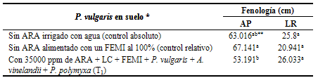 En la tabla 2, se presenta la fenología de P. vulgaris con A. vinelandii . P. polymyxa, en el tratamiento del suelo con 35000 ppm de ARA que registró 53.191 cm de AP, valor numérico estadísticamente diferente en comparación con los 67.141 cm de P. vulgaris en el suelo sin contaminar con el ARA y alimentado con el FEMI, ambos valores numéricos sin diferencia estadística en relación con los 63.016 cm de P. vulgaris en el suelo sin ARA irrigada solo con agua, en tanto que la LR de P. vulgaris potenciado con A. vinelandii . P. polymyxa en el suelo con ARA se registró 26.033 cm valor numérico sin diferencia estadística comparado con los 20.941 cm y 25.8 cm de LR que se registraron de P. vulgaris en el suelo usado como CR y de la fenología de P. vulgaris en el suelo CA respectivamente.