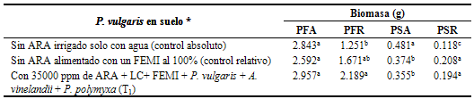 En la tabla 2, se presenta el crecimiento radical de P. vulgaris potenciado con A. vinelandii y P. polymyxa que decrecieron la concentración del ARA, en parte porque el sistema radical de P. vulgaris fue mayor cuando se potencio con A. vinelandii y P. polymyxa, lo que indica que ambas bacterias mediante conversión de los exudados de la raíz, en fitohormonas mejoraron la absorción del sistema radical de la leguminosa por las sales de N, el P y el K, del FEMI. Además de que contribuyeron a la eliminación del ARA, con lo que P. vulgaris tolero mas su toxicidad, pues el crecimiento de P. vulgaris con A. vinelandii y P. polymyxa en funcion de la fenologia y biomasa fue sano14,17,20,22,24, incluso mejor en algunas variables que misma la legumi nosa crecida en el suelo sin contaminar por el ARA.
