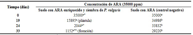 En la tabla 4, se presenta el efecto del enriquecimiento del suelo contaminado por ARA con la LC, y el FEMI para la posterior siembra de P. vulgaris inoculado con A. vinelandii y P. polymyxa. Ahí luego de los 19 días después de la siembra de P. vulgaris, la concentración de 35000 ppm de ARA, se redujo hasta 15895 ppm, valor numérico estadísticamente diferente comparado con los 34986 ppm de ARA en el suelo referido como CN, mientras que en el suelo luego de 24 días de la siembra, P. vulgaris inoculado con A. vinelandii y P. polymyxa a plántula, se registró un reducción del ARA hasta 2044 ppm concentración inferior al límite máximo de la NOM-138, este valor numérico fue estadísticamente diferente comparado con los 33832 ppm de ARA en el suelo contaminado con el ARA sin tratar por enriquecimiento ni con la siembra de P. vulgaris. En contraste 33 días después de la siembra de P. vulgaris con A. vinelandii y P. polymyxa se registró el máximo decremento del ARA hasta 1152 ppm, concentración menor a la máxima permisible por la NOM-138, lo que indica que el suelo se recuperó. Este valor de 1152 es un valor numérico estadísticamente diferente en comparación con los 29220 ppm de ARA en el suelo con ARA usado como CN.