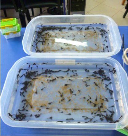 Obtención de los estados inmaduros de R. spinulosa: Fueron obtenidos del rio Huatatas cerca de la ciudad de Ayacucho, se trasporto en baldes al LSIGB-FCB, luego fueron estabuladas en bandejas con agua declorada, 24 h antes de la prueba de toxicidad, para evitar que las excretas y restos orgánicos interfiera en los resultados del experimento. Dichos individuos fueron seleccionados de un tamaño homogéneo de aproximadamente 2 a 2.5 cm, figura 1 y 2. Se utilizó 3 g de cada fármaco comercial (ibuprofeno: 400 mg, naproxeno: 550 mg y diclofenaco: 50 mg) expendidos en la ciudad de Ayacucho.