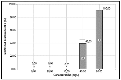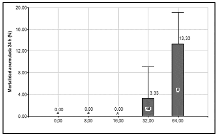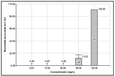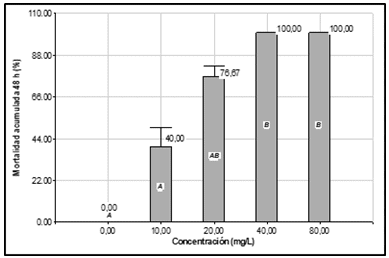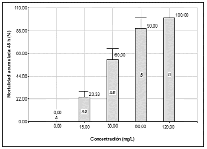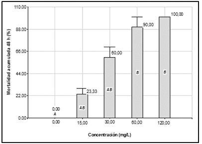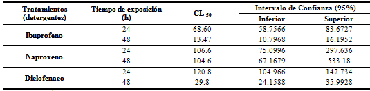 La mortalidad generada fue menor a las 24 h, mientras a las 48 h fue incrementándose en los tres fármacos estudiados, al hacer la comparación en las concentraciones se halló que la CL50 tiende a disminuir a medida que el tiempo de exposición al tóxico se incrementa.