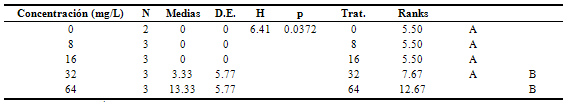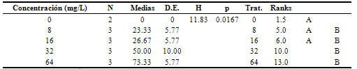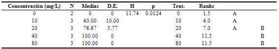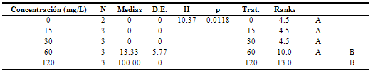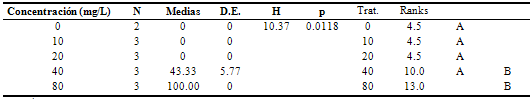 Análisis estadístico: Los datos obtenidos fueron utilizados para la construcción de una matriz de datos en el software Excel, para luego ser exportados a InfoStat17 y MINITAB 1618, se elaboraron tablas y figuras con datos estadísticos de tendencia central y de dispersión, con la finalidad de comparar las mortalidades registradas de los individuos en los doce tratamientos (tres fármacos probados en cuatro concentraciones crecientes) más un testigo, se empleó el análisis de Kruskal-Wallis19, debido a que los datos no mostraron distribución normal Para la estimación de la concentración letal media (CL50)16,20, para el cual se empleó el software MINITAB 1618 para realizar los análisis estadísticos señalados.