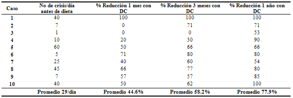 En la tabla 1 podemos observar que el porcentaje de reducción en cada caso fue significativo desde los 3 meses y mejorando al llegar al año de tratamiento, esto se evidenció mediante análisis del diseño ANOVA de un factor con medidas repetidas tanto como en la prueba de los efectos inter-sujetos donde p=0.006 al comparar el número de crisis previas a la DC vs el número de crisis al año de la DC. Al igual hubo significancia al comparar el número de crisis previo a la DC vs el número de crisis a los 3 meses, p=0.05.