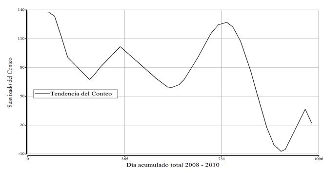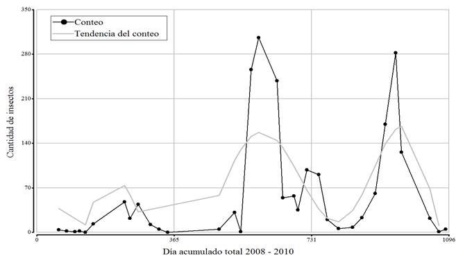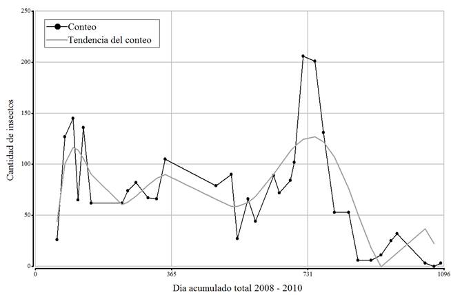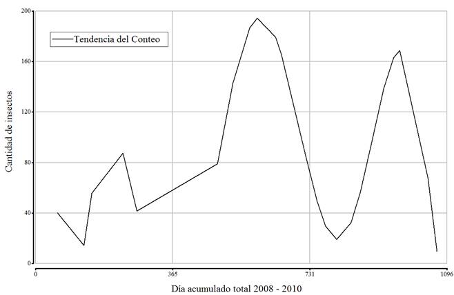 El Diagrama de dispersión del Conteo de C. capitata con el día acumulado total, de los tres años de inspección (Figura 9), muestra que existe un comportamiento similar en cada año. Tal como se vio en el anterior análisis, la mayor cantidad de población sucede a mediados de año, durante la maduración de cítricos como frutales hospederos. Mientras que los niveles más bajos de población coinciden con la época de mayor precipitación y humedad. Sin embargo, la competencia por alimento, contra el género Anastrepha, influye también en la reducción de población de C. capitata.