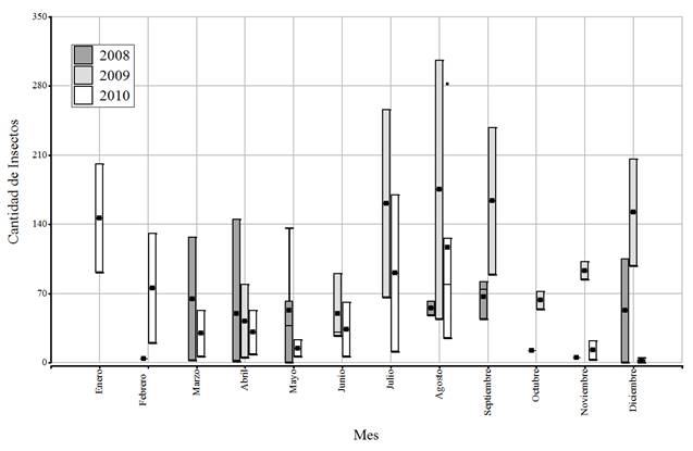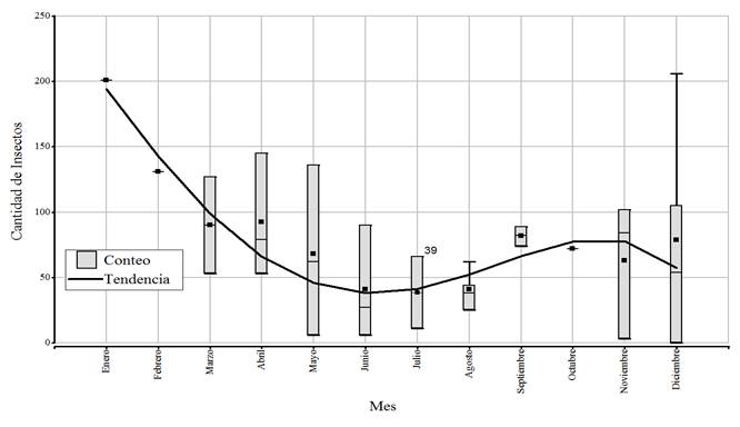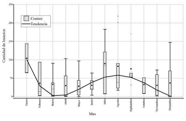 Se compararon los datos mensuales del conteo con la herramienta gráfica Box Plot, sin diferenciar a las especies, primero los años por separado, y luego agrupados. Con estos análisis se identificaron los meses con mayor variación y los valores de media más altos. Posteriormente se identificaron los meses que acumularon tres muestreos, uno por año, y los que tuvieron menos. También se identificaron los meses de mayor población y la variación entre ellos. Se aplicó una línea de tendencia polinomial a cada análisis, que permitió reconocer con claridad la fluctuación poblacional de la plaga.