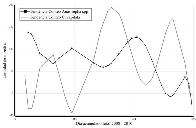 El siguiente análisis gráfico comparó la fluctuación poblacional de C. capitata y el complejo Anastrepha spp., frente al tiempo acumulado total de los tres años.