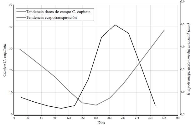 El análisis gráfico con Box Plot, para el conteo (Figura 8) muestra que la población de C. capitata comienza a incrementar levemente desde el mes de abril y llega a su pico máximo entre agosto y septiembre. El incremento inicial se relaciona más con la disponibilidad de alimento que a las condiciones climáticas, pues coincide con la maduración de frutales hospederos, como las naranjas, mandarinas, limas y toronjas Criollas. Posteriormente incrementan su población con la maduración de naranjas Valencias y mandarinas Scarlet. La evapotranspiración es la principal covariable ambiental que influye en este incremento poblacional. Sin embargo, la reducción de la población se debe más al desplazamiento que sufre la C. capitata, por parte del complejo de especies Anastrepha spp., en la competencia por alimento.