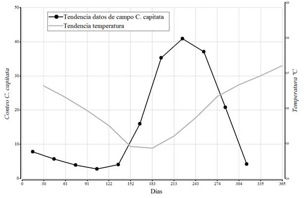 La temperatura influye significativamente sobre la tasa de desarrollo y en el número de generaciones por año. El insecto debe acumular un determinado número de grados de temperatura, para pasar al siguiente estadio, por lo que a temperaturas más elevadas, se espera un ciclo de vida más corto. La capacidad de adaptación de C. capitata, explica como en la época fría, y ayudada con la disponibilidad de alimento, consigue incrementar su población, hasta que el incremento de la temperatura facilita el crecimiento de Anastrepha spp., (Figuras 17 y 18).