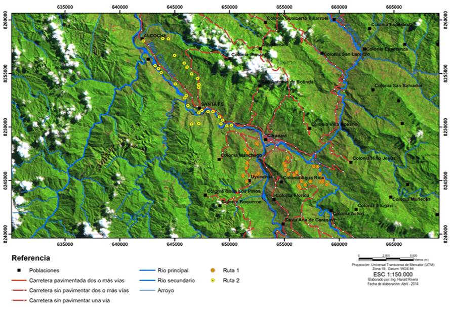 Distribución espacial. La distribución de las trampas en cada ruta de muestreo, respondió a los lineamientos que tiene el PROMOSCA, tomando en cuenta criterios de factibilidad de instalación y relevancia de la zona (Figura 1).