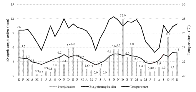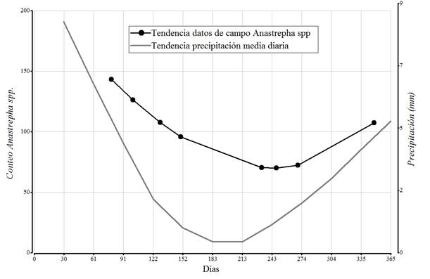 There is a correlation between the climate, fruit trees and population fluctuation of the pest. C. capitata reaches its maximum population in August, during the dry season and the ripening of citrus, while Anastrepha spp., in December, coinciding with high temperatures and maturation of mangoes, mangos, avocados and oranges. Evapotranspiration is the main environmental variable for C. capitata, and precipitation, for the genus Anastrepha spp. No covariate related to biological cycle intervenes in the population fluctuation.