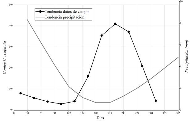 La población desciende hasta sus niveles más bajos durante febrero y marzo. Esto coincide con las épocas de mayor precipitación y humedad en la zona. Así mismo, los coeficientes de estas covariables, obtenidos en el modelo, indican una correlación negativa, donde a mayor precipitación y humedad, existe menor población de C. capitata. (Figura 8).