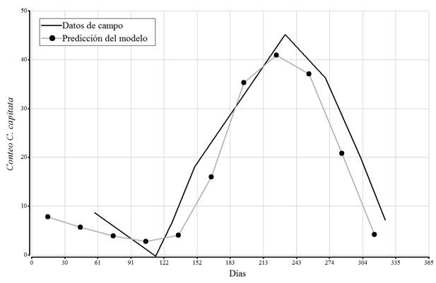 Finalmente, C. capitata llega a su máximo de población en agosto, mientras que el mínimo sucede entre febrero y marzo, el modelo mínimo es el A, que tiene valores de AIC y BIC de a 200.13 y 228.15 respectivamente. El valor D2 es de 21.53. Los valores r=0.6 y R2=0.4 confirman que el modelo genera datos altamente correlacionados con los datos en campo, y que el modelo tiene capacidad predictiva.