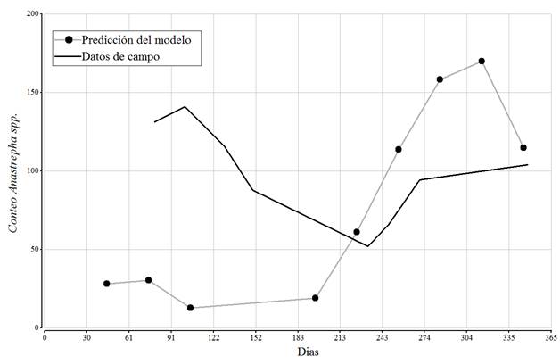 Para el complejo de especies de Anastrepha spp., el nivel máximo de población se encuentra en diciembre, tocando los niveles más bajos, durante mayo y junio. El modelo adecuado mínimo es el modelo A, con valores de AIC y BIC que llegan a 257.78 y 291.41 respectivamente. El valor D. es de 43.62. Los valores r=0.3 y R2=0.1 , muestran que los generados por el modelo tienen baja correlación con los datos de campo, y que el modelo tiene baja capacidad predictiva.