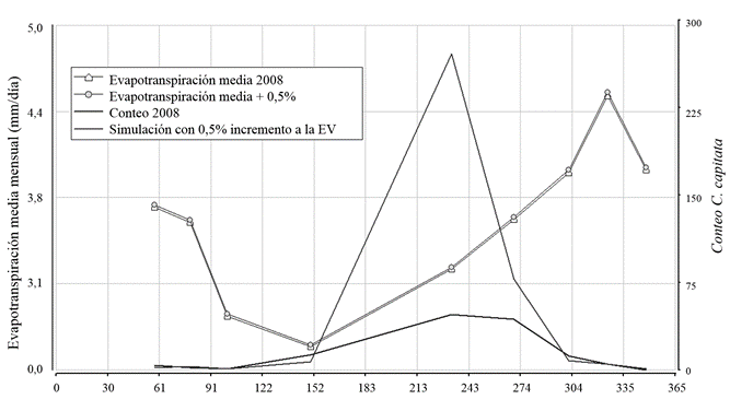 La figura 23 muestra que para C. capitata, en base a los datos del 2008, un aumento de 0.5% en la evapotranspiración media mensual, significa un incremento en la población estimada de más de 300%. Esta alza se observa también comparando el 2008 con el año 2010, donde inicialmente la evapotranspiración media llegó a 3.42 mm/día y las capturas a 153, mientras que en el 2010 llegó a 3.89 mm/día, con 879 capturas. La evapotranspiración está condicionada por la cantidad de precipitación, temperatura y horas sol, por lo que un ascenso drástico en estos valores, debido al cambio climático, puede desencadenar un incremento de la población de C. capitata.