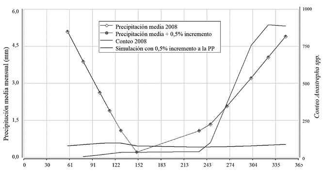 En cambio, la precipitación media es la variable ambiental que más influye en la fluctuación poblacional del género Anastrepha. Un incremento del 0.5% a los valores obtenidos el 2008, representa un aumento alrededor del 300%, de 1017 capturas en campo, a 3043 como dato proyectado. En la figura 24 se observa como la precipitación influye drásticamente en la fluctuación poblacional del género Anastrepha. El cambio climático puede ocasionar un incremento en la cantidad de lluvias en la zona, y esto, provocar una mayor presencia de la plaga. No obstante, debe considerarse que la precipitación depende de factores como la temperatura y la evaporación.