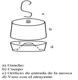 Trampa McPhail modificada. Son frascos de plástico resistente a los rayos ultravioleta, denominados “tipo multilure”. Tienen una tapa transparente con un alambre para ser colgada del hospedero (Figura 2), y abertura invaginada en la base, por donde entra la mosca. En su interior se coloca un atrayente proteico, donde la mosca muere ahogada, más pastillas de bórax, para su conservación. Ésta captura especies del Género Anastrepha y Ceratitis, Matheus-Gómez (2005), en su interior normalmente lleva una mezcla de 250 cm., compuesto por agua, proteína hidrolizada, y bórax, en una proporción de 100:10:2.