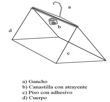 Trampa Jackson. Consiste en un cuerpo triangular, que en su base aloja una laminilla pegajosa cambiable, donde quedan atrapadas las moscas. Por el vértice superior se acopla un gancho para quedar sostenida al árbol (Figura 3), y atravesando el gancho, puede usarse una mecha de algodón con el atrayente o una canastilla que aloja al atrayente en forma de pastillas. Se usan pastillas de los atrayentes Trimedlure, MetilEugenol y Cuelure (Matheus-Gómez 2005). Su capacidad de captura es de 18%, de la población presente en esa superficie, esta trampa captura especialmente especies del Género Ceratitis y Anastrepha.