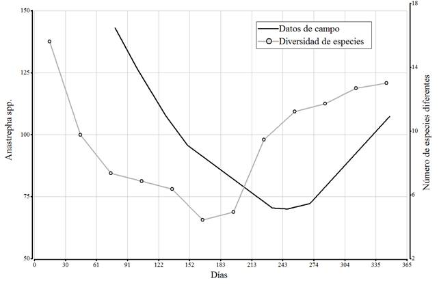 La diversidad de especies se incluye en el modelo del complejoAnastrepha spp., con un coeficiente de -0.04, debido a que desde septiembre con mejores condiciones ambientales, existe mayor presencia del género, donde las especies más débiles del complejo, aprovechan para incrementar su población. Con este incremento, se inicia el desplazamiento progresivo de C. capitata (Figura 5). Durante esta época es recomendable realizar controles mecánicos y etológicos.