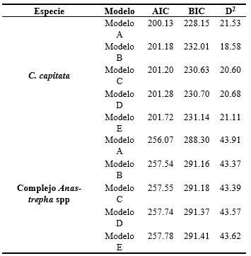 El modelo adecuado mínimo para C. capitata, tiene valores de AIC y BIC de 200.13 y 228.15 respectivamente. Su valor D2 es de 21.53. Así mismo, para el complejo Anastrepha spp., tiene valores de AIC y BIC de 256.07 y 288.30 respectivamente. Su valor D2 es de 43.91, ambos modelos en un rango aceptable.