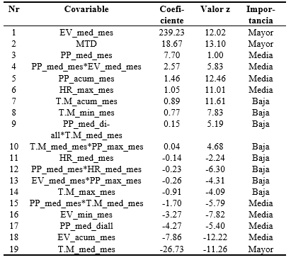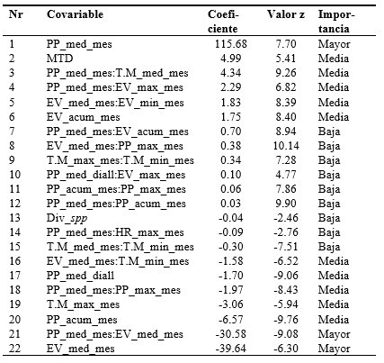Para C. capitata, la “evapotranspiración media del mes” es la principal covariable que influye en la fluctuación poblacional, con un coeficiente de 239.23 Tabla 6. Este factor influye en la movilidad de partes del cuerpo y su regulación térmica, por lo que las funciones reproductivas pueden verse afectadas en condiciones de baja evapotranspiración (Toro et al. 2003), sin embargo, la mayor cantidad de población de C. capitata acontece en una época de bajos valores de evapotranspiración, pero de maduración de frutales hospederos (cítricos). De igual forma, las covariables que siguen en importancia, temperatura (-26.73), precipitación (7.70) y humedad relativa (1.05), registran valores bajos de julio a septiembre, durante la máxima población de la plaga, lo que muestra capacidad de adaptación a las condiciones ambientales y dependencia a la disponibilidad de alimento.
