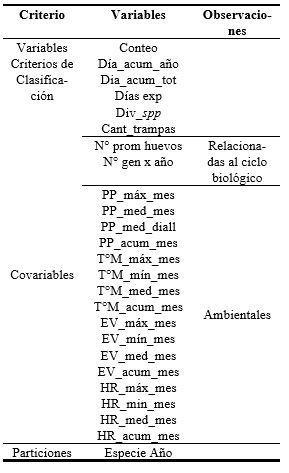Se seleccionaron 16 covariables ambientales de los datos disponibles, que consideraban valores mínimos (min), máximos (máx), medios (med) y acumulados (acum), de la precipitación (PP), la temperatura media (TºM), la evapotranspiración (EV) y la humedad relativa (HR). Estas covariable fueron introducidas a la base de datos. En el caso de la precipitación, se utilizó también los valores registrados sólo en días lluviosos (diall).