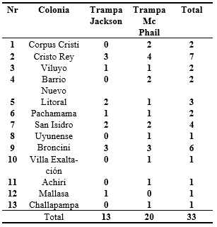 La cantidad total de trampas en servicio durante los tres años de monitoreo, varió de 52 a 66. Ésta variación se debió a una ampliación del área de trampeo en cada ruta. La cantidad de trampas usadas en las rutas, llegó a cubrir un área aproximada de 10.6 ha, por lo que con la aplicación de los modelos generados, se puede proyectar los valores obtenidos a más zonas productivas en Caranavi. De la totalidad de trampas, 27 fueron del tipo Jackson con trimedlure, que atrae más insectos del género Ceratitis, y 39 del tipo McPhail con proteína hidrolizada. Esta proporción logro capturar durante los tres años de monitoreo a 2049 individuos de C. capitata, y a 2400 del género Anastrepha. Esto muestra una mayor efectividad de las trampas tipo Jackson con trimedlure, de esa forma, para mejorar la metodología de trampeo, puede instalarse la misma cantidad de trampas, y obtener datos más confiables.