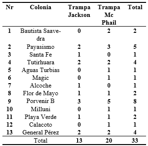 Ruta 2. Esta ruta se extiende desde los límites del área urbana, hacia la parte norte del municipio y sus colonias. Comenzó con 28 trampas y finalizó con 33, 13 trampas tipo Jackson y 20 trampas tipo Mc Phail (Tabla 2).