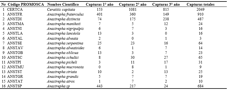 Analizando los ROT de los tres años de trabajo, se pudo observar que hubo una mayor captura de individuos del género Anastrepha spp., frente al género Ceratitis. Esto puede deberse a la mayor disponibilidad de plantas hospederas para el género Anastrepha, y a que este último, está compuesto hasta por 16 especies diferentes en Caranavi, mientras que el otro género solo tiene la mosca del mediterráneo C. capitata.Tabla 4. En tanto Nolasco & Iannacone (2008), capturo: C. capitata, A. distincta, A. fraterculus, A. serpentina, en Piura e Ica, Perú.