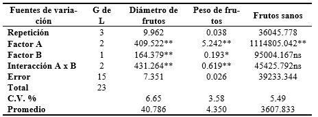 Análisis de varianza para diámetro, peso y sanidad de frutos. En la Tabla 4, se presentan el análisis de varianza para diámetro de frutos, se observó diferencias altamente significativas (Pr<0.01) para todas las fuentes de variación. En el peso de frutos las diferencias altamente significativas para el factor A (tipos de fermentos) y la interacción tipos de fermentos por colores de trampas, el Factor B también fue significativamente diferentes (Pr<0.05). La variable frutos sanos, presentó diferencias altamente significativas (Pr<0.01) para el Factor A (tipos de fermentos), las otras fuentes evaluadas no presentaron diferencias estadísticas.