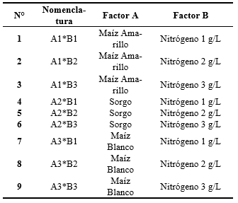 Diseño experimental. Los factores de estudio fueron: Factor A: forrajes, se evaluó al maíz amarillo INIAP 542, maíz blanco INIAP 528 y sorgo forrajero variedad Pampa Verde. Factor B: dosis nitrogenadas de 1, 2 y 3 g/L de agua respectivamente. El experimento fue implementado en un diseño de experimental de bloques completos al azar (BCA) con arreglo factorial de 3 x 2 (Gabriel et al. 2017), con nueve tratamientos y cinco repeticiones, que correspondieron a 45 unidades experimentales (UE) (Tabla 1). No se utilizó ningún testigo, debido a que este tipo de investigación no se realizó antes en la zona.
