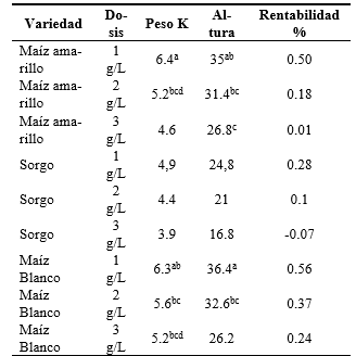 Las letras iguales en el peso, altura y rentabilidad no denotan diferencias significativas al Pr <0.05 de probabilidad con la prueba de Tukey