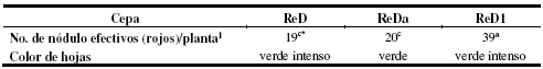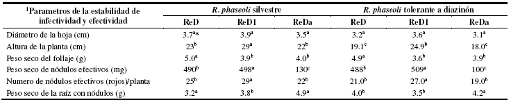 En la tabla 1 se muestra el efecto de las cepas de R. phaseoli tolerantes a diazinón en el crecimiento de P. vulgaris en función del número de nódulos efectivos que determinan una condición de salud vegetal con 19, 20, 39 generados respectivamente por las cepas de R. phaseoli resistentes a diazinón denominadas ReD, ReDa y ReD1. En relación al color de las hojas de P. vulgaris fueron indicadoras de que las cepas infectaron las raíces de P. vulgaris con nódulos de color rojo (efectivos), lo que indica la presencia de leghemoglobina asociada con la capacidad de fijar N2 y el color verde e intenso en las hojas1.