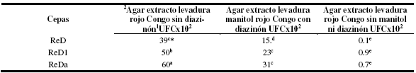 * AELMRC=Agar extracto levadura manitol rojo Congo ** Letras iguales sin diferencia significativa (<0.05) según Tukey.En la tabla 4 se muestra el crecimiento como UFC, registrado en las cepas de R. phaseoli tolerantes a diazinón, la literatura señala que puede ser por una acción de coometabolismo cuando usan el manitol para la degradación del diazinón, en esta tabla fue evidente que cuando R. phaseoli creció en manitol y diazinón se registró un decremento de la cantidad de colonias como UFC, porque aunque R. phaseoli lo degradan fue toxico para una parte de la población total de R. phaseoli, en comparación cuando creció en el AELMRC sin diazinón, que representa la cantidad del crecimiento en UFC esperado, mientras que al suprimir el manitol como el diazinón, la ausencia de ambas causo un drástico disminución de la población de R. phaseoli, porque los otros componente del AELMRC: como el extracto de levadura y rojo Congo fueron insuficientes para que R. phaseoli, pudiese reproducirse al nivel que registró cuando el medio de cultivo contenía el manitol como única fuente de carbono y energia1.
