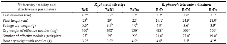 Table 1 shows the effect of diazinon-tolerant R. phaseoli strains on the growth of P. vulgaris as a function of the number of effective nodules that determine a plant health condition with 19, 20, 39 generated respectively by the strains of R. phaseoli resistant to diazinon called ReD, ReDa and ReD1. Regarding the color of P. vulgaris leaves, they were indicative that the isolated infected the roots of P. vulgaris formed red nodules (effective), which indicates the presence of leghemoglobin associated with its capacity to fix N2 and the color intense green on the leaves1.