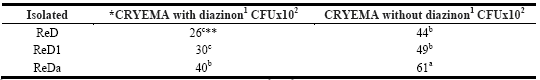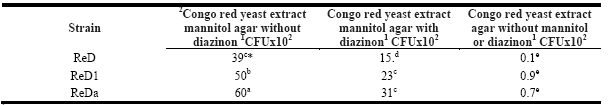 1* average of 4 repetitions in CFU = Colony Forming Units x102/mL *CRYEMA = congo red yeast extract mannitol agar.