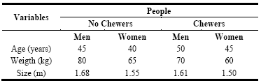 The second group made up of the problem group or the true coca leaf chewers in terms of the average age was 50 years for men and 45 years for women, 70 kg for men and 60 kg for women, and with the size of 1.61 for men and 1.50 for women. These results show that the high Andean people of the control group, who do not chew coca leaves, already in their diet is varied since the influence of the media has generated a change in habit, some people even dedicate themselves to fairs to the exchange of processed products, meat, milk among others, in terms of age they are young adults, with more muscle mass and weight and taller in height. However, people who chew coca leaves are older, light, and very short, which is why this difference is due. The coca leaf chewers do not have balanced food, sometimes they eat and more use the coca leaves for their work, avoid hunger and continue with their work, we have also noticed that they suffer a lot from digestive problems, hernias, and abdominal pain, Well, that corresponds to another research work.