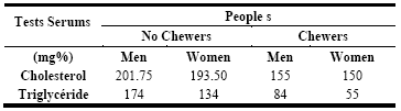 Regarding the results of the control group: cholesterol levels (201.75 mg% men and 193.50 mg% women) and triglyceride levels (174 mg% men and 134 mg% women) being statistically significant with the ANOVA test compared to the problem or case group, whose cholesterol levels (155 mg% men and 150 mg% women) and triglyceride levels (84 mg% men and 55 mg% women) statistically significant. The inclusion criterion was that they are coca leaf chewers, and informed consent was also obtained.