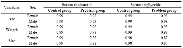 In Table 3, the simple correlation coefficient between cholesterol and serum triglyceride levels in people who chew coca leaves and who do not chew, according to age, weight and height in both sexes. The linear correlation coefficient is the quotient between the covariance and the product of the standard deviations of both variables. The linear correlation coefficient is represented by the letter r. whose properties are: the correlation coefficient does not vary as the measurement scale does. That is, if we express the height in meters or centimeters, the correlation coefficient does not vary. The sign of the correlation coefficient is the same as that of the covariance. If the covariance is positive, the correlation is direct. If the covariance is negative, the correlation is inverse. If the covariance is zero, there is no correlation. That is, the linear correlation coefficient is a real number between -1 and 1. If the linear correlation coefficient takes values close to 1, the correlation is strong and direct, and it will be stronger the closer it is to 1. Yes the linear correlation coefficient takes values close to 0, the correlation is weak. Our results for both age, weight and height are close to 1, which is why it is positive and direct36.