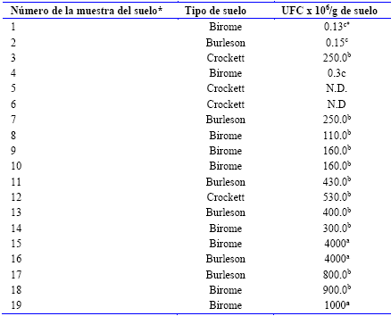 Birome = Arenoso-limoso., Burleson = Arenoso., Crockett = Arenoso-limoso, Suelos del condado de Denton, Texas., N. D= No se detectó ningún posible Azotobacter spp