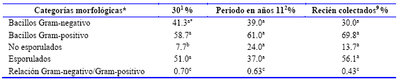 En la Tabla 2, se presentan los porcentajes de bacterias en el suelo almacenado por diferentes periodos de tiempo, de acuerdo con la morfología y reacción a la tinción Gram, el mayor porcentaje fueron bacilos Gram-positivo con 58.7 % en el suelo almacenado por 30 años. Con 61.0 % del suelo almacenado por 11 años y 69.8 % del suelo recién colectado. Es evidente el contraste con el porcentaje del grupo no esporulado, de manera esperada fue menor en el suelo de 30 años, que tuvo diferencia estadística comparado, con el mayor por ciento en los no esporulados en el suelo de 11 años de almacenamiento, así como en el suelo recién colectado.