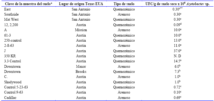 En la Tabla 5 se observó una diferencia estadística entre la densidad de la población de Azotobacter presentes en los suelos tipo Crockett, en comparación con la densidad de las poblaciones de Azotobacter de los suelos tipo Birome y Burleson. En principio por las propiedades fisicoquímicas de los suelos analizados, en el caso de Birome de textura arenosa-arcillosa, pobre en MO, pH alcalino. A diferencia del Burleson de textura arcillosa, con bajo nivel de MO y pH ligeramente alcalino. Por lo que en suelos tipo Birome se detectó un intervalo de variación de la población de Azotobacter desde 0.13 x 106 hasta 400.0 x 107 UFC/g de SS, con valores numéricos sin diferencia estadística comparados con la población de Azotobacter de la serie Burleson, lo que apoya que Azotobacter y sus especies son cosmopolitas de estos suelos independientemente de la vocación agrícola y/o ganadera de explotación: para pastoreo o bien vírgenes situación observada en los suelos analizados del centro norte del estado de Texas, EUA29,31-33.