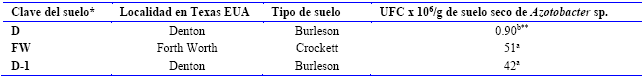 En la Tabla 4, se presenta que la densidad de la población de Azotobacter supervivientes en suelo almacenado por 11 años, se registraron desde 51 x 106 UFC/g de suelo tipo Crockett con clave FW de Forth Worth, Tx cuyo valor numérico tuvo diferencia estadística con los 0.90 x 106 UFC/g del SS codificado como D, tipo Burleson de Denton, Tx, aunque en el otro del mismo tipo codificado como D-1 se detectó mayor densidad 42 x 106 UFC acuerdo este resultado, lo que muestra que suelos similares en la misma área pueden contener diferente densidad de Azotobacter, atribuido a que uno el D fue sometido a cultivo intensivo de Zea mays y el otro es un terreno usado para pastoreo de ganado vacuno12,16,27.