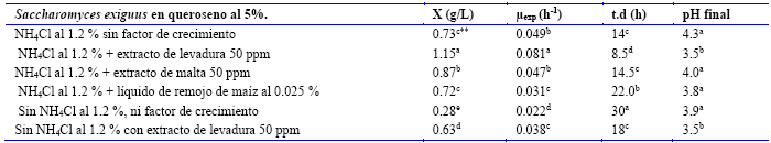 En la Tabla 1, se muestra el crecimiento de S. exiguus en queroseno al 5 % cuando lo utilizo como fuente de carbono y energía con el NH4Cl al 1.2 %, enriquecido con el extracto de levadura, donde se registró el mayor rendimiento o producción celular de hasta 1.15 g/L con una máxima velocidad de crecimiento de 0.081 h-1, con un menor tiempo de duplicación de 8.5 h, que causo una disminución de pH hasta 3.5. Lo anterior que mostro que la composición química del medio mineral con el queroseno al 5 %, el NH4Cl, el extracto de levadura como factor de crecimiento fueron la mejor condición nutricional para la biodegradación del queroseno.
