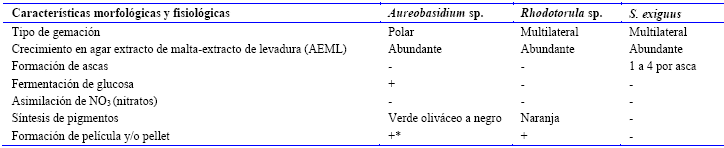 En la Tabla 2, se muestran las características morfológicas y fisiológicas de los géneros y especies de levaduras aisladas de diferentes pozos petroleros de PEMEX de la ciudad Altamira, Tam., México, que utilizan el queroseno como única fuente de carbono y energía. Las que de acuerdo con las características morfológicas y fisiológicas de los géneros levaduras en los medios de cultivo empleados para la identificación como: AS, caldo malta levadura (CML), Gorodkowa, agar acetato de Fowell, Starkey´s etanol, Wickerham y las descritas en el Manual de Lodder30 y de Phaff et al.31, en relación al género Aureobasidium, con células ovales de gemación polar, sin ascosporas, con micelio septado, blastosporas y clamidiosporas, que forma un tipo de pellet en cultivos líquidos, no fermentó la glucosa, aunque en anaerobiosis redujo los NO3. a NO2..