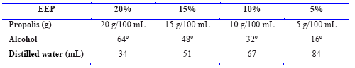 The dilutions of ethanolic extracts of propolis (EEP) were prepared with distilled water, alcohol and crude propolis according to the volume to be prepared and the amount in grams of said product that was needed for each dilution. To carry out the dilutions, the method described by Sforcin21 was taken into account, who used 30 g of propolis to elaborate a dilution in 100 mL of 70 % alcohol, although under laboratory conditions a sample of propolis (30 g), to which 100 mL of 96 % alcohol of this pure formulation was added, the different calculations of the dilutions with lower concentration of propolis and alcohol were made. After preparing the four solutions, they were kept in amber containers protected from light for 14 days. Several times a day all the dilutions were homogenized to help the propolis to contribute its bioactive properties in the ethanolic preparation. At the end of the period, the dilutions were purified on sterile filter paper, keeping the extracts in amber bottles at room temperature.